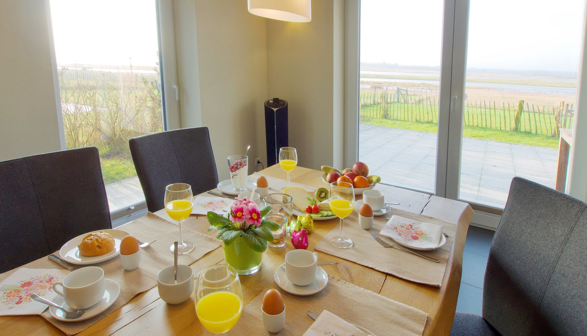 Direkt von Ihrer Terrasse können Sie Austernfischer, Kraniche, Silberreiher, Kiebitze, Gänse, Seeadler und die Highland Rinder mit ihren Kälbern auf den Salzwiesen beobachten
